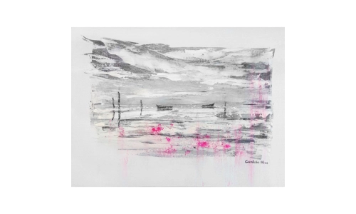 BARQUE A L'ETANG, MINERAL FUCHSIA 54X73cm acrylique au couteau