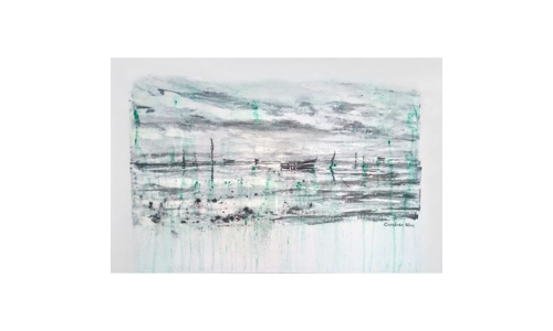 BARQUES A L'ETANG, MINERAL VERT 60X81cm, acrylique au couteau Summary