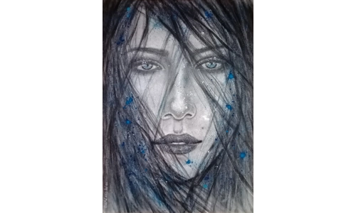 Fusain, pigments Sennelier et paillettes sur toile coton marouflée sur carton mousse.