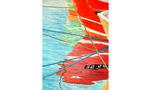 Jeu de cordes et de reflets colorés ondulants de coques de bateaux posées côte à côte doucement bercées par la mer qui redessine et renomme leur silhouette inlassablement...