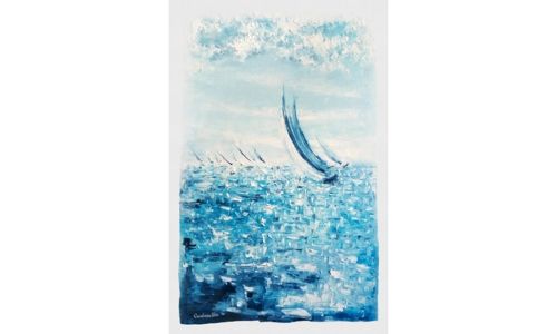 Bleu saphir aux éclats aveuglants, horizon azur infini, voiles blanches gonflées à bloc par le souffle du Dieu Vent, les dériveurs glissent sur une mer bienveillante que le soleil pixelise d'éclats de lumière, dans une course effrénée.
