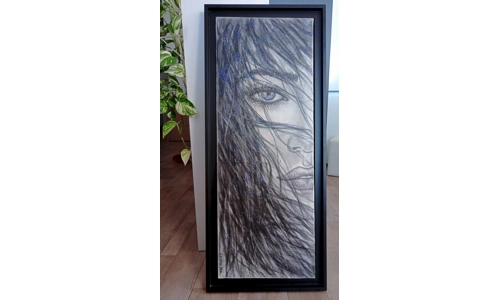 Fusain et paillettes sur châssis entoilé en coton. Œuvre originale signée et vernie - 2024. Toile encadrée avec caisse américaine noir mat. Option sans cadre : 690 €