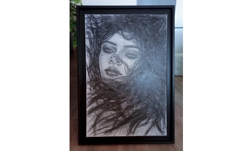 Fusain et paillettes sur châssis entoilé en coton. Œuvre originale signée et vernie - 2024. Toile encadrée avec caisse américaine noir mat. Option sans cadre : 650 €