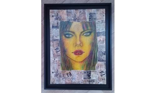 DANU SPIRIT . Fusain, encres aquarelles et collage papier décoratif sur carton mousse. Œuvre originale signée et vernie - 2025.